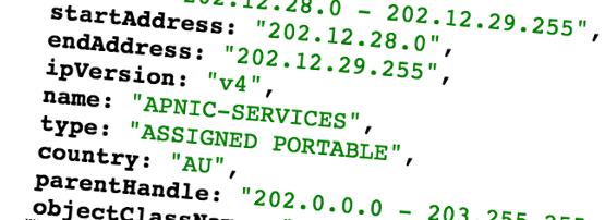 Queries are issued as HTTP(S) requests, asking for details of an autonomous system number, an IP (v4 or v6) range, an entity (person, role, mnt-irt), or a domain (reverse zone). The response is in the JavaScript Object Notation (JSON), which means clients can be written as web widgets, embedded in web pages. The following brief JavaScript snippet loads an RDAP record for APNIC’s primary AS number, AS4608: