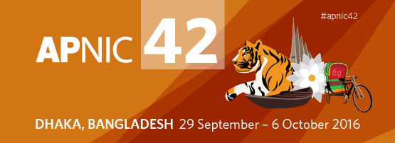 In 2016, APNIC 42 will be held in Dhaka, Bangladesh on 29 September to 6 October.