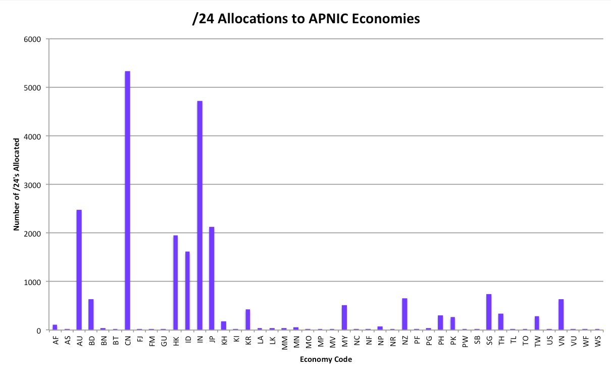 There are a couple of anomalous entries in the APNIC registry that show four allocations of /21 (2,048 addresses) and one allocation of a /20 (4,096 addresses). In one case (103.23.80.0/21) this appears to be a transcription error when passing registration data from the Korean KRNIC data base to the APNIC database (103.23.80.0/22 and 103.23.84.0/22). The other anomalous entries (103.51.168.0/21, 103.51.184.0/21, 103.51.192.0/21 and 103.51.240.0/20) are not so readily explained. One entity appears to be holding some 14,336 addresses from this address block, well above the policy-determined upper limit of allocations of 1,024 addresses per entity. Presumably there has been some post-allocation mergers that would account for this apparent anomaly.