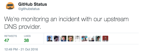 While Dyn announced at 13:20 UTC that their services had been restored, solving the issue took longer, with the attack continuing to affect their infrastructure into the afternoon. At 15:52 UTC, Dyn reported “we have begun monitoring and mitigating a DDoS attack against our Dyn Managed DNS infrastructure. Our Engineers are continuing to work on mitigating this issue.”