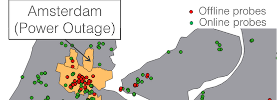 In Figure 2, we show a recent power outage in Amsterdam that was detected by our geo-stream on 17 January 2017. A large proportion of RIPE Atlas probes is concentrated within the boundaries of the city affected by the power outage. Interestingly, 19 of the probes in that disconnect burst are outside of the city boundaries. All these probes are hosted in a single network.