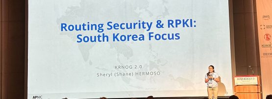 - Shane Hermoso delivered a presentation on ‘Routing Security & RPKI’ where she explained how and why resource holders should create Route Origin Authorizations (ROAs) and implement Route Origin Validation (ROV), and explored RPKI deployment stats within South Korea.