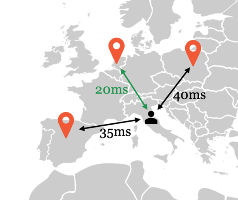 Assumption One: Clients are routed to the anycast site with the lowest latency. This assumption is based on the ‘shortest path’ policy in BGP, which we translate to ‘smallest RTT from client to server’. We know this assumption doesn’t always hold — it can be seen as the best-case scenario — but it’s the best heuristic we have. We illustrate this assumption in Figure 1. There we assume the client in Italy is routed to the server in Amsterdam, because it has the lowest latency.