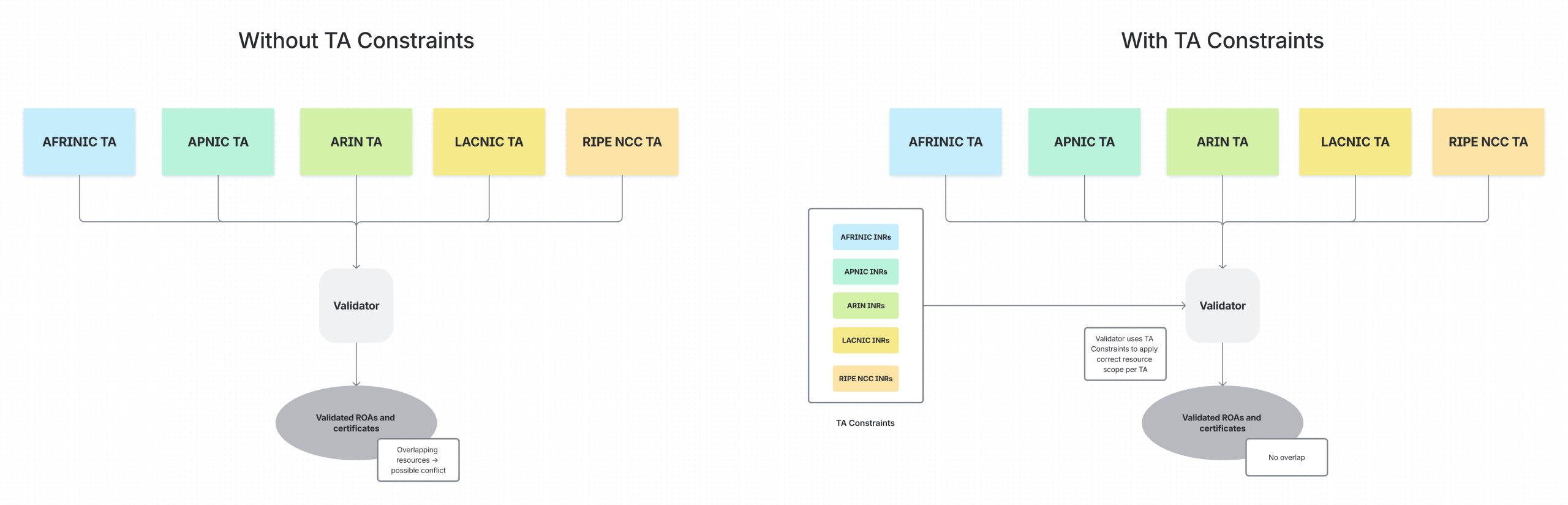 In the context of the Resource Public Key Infrastructure (RPKI), validation is performed by Relying Party (RP) software. RPs are commonly configured with five Trust Anchors (TAs), one for each of the Regional Internet Registries (RIRs). Each TA operator can make arbitrary RPKI statements about Internet Number Resources (INRs) independently of the other TA operators: For example, one TA could issue a Route Origin Authorization (ROA) for resources that have actually been assigned to another TA. The fact that TAs can claim resources for which they are not authoritative has created concerns among the technical community.