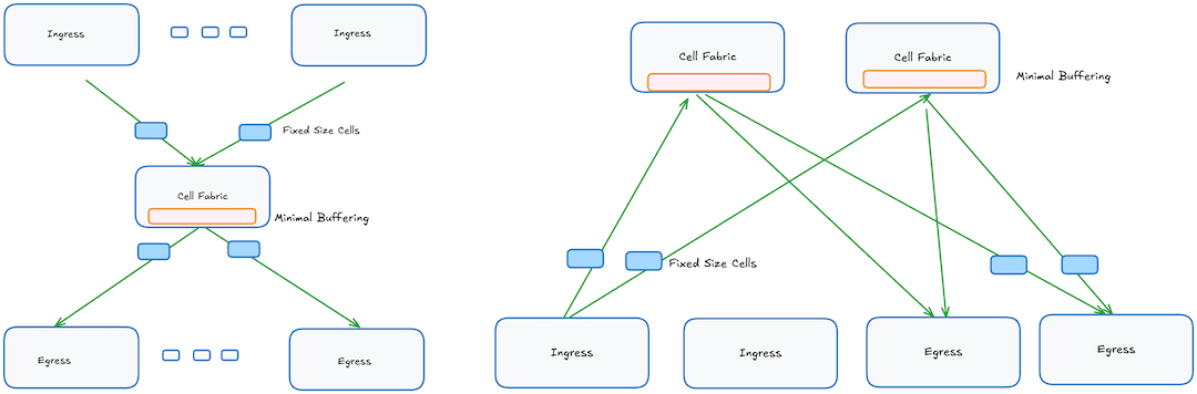 The cell fabric, whether it’s internal to a switch fabric or distributed, must have some minimal buffering to handle the contention when cells from multiple inputs compete for an output link. Shallow buffers are also important to provide minimal latency and jitter for the cells travelling the fabric.
