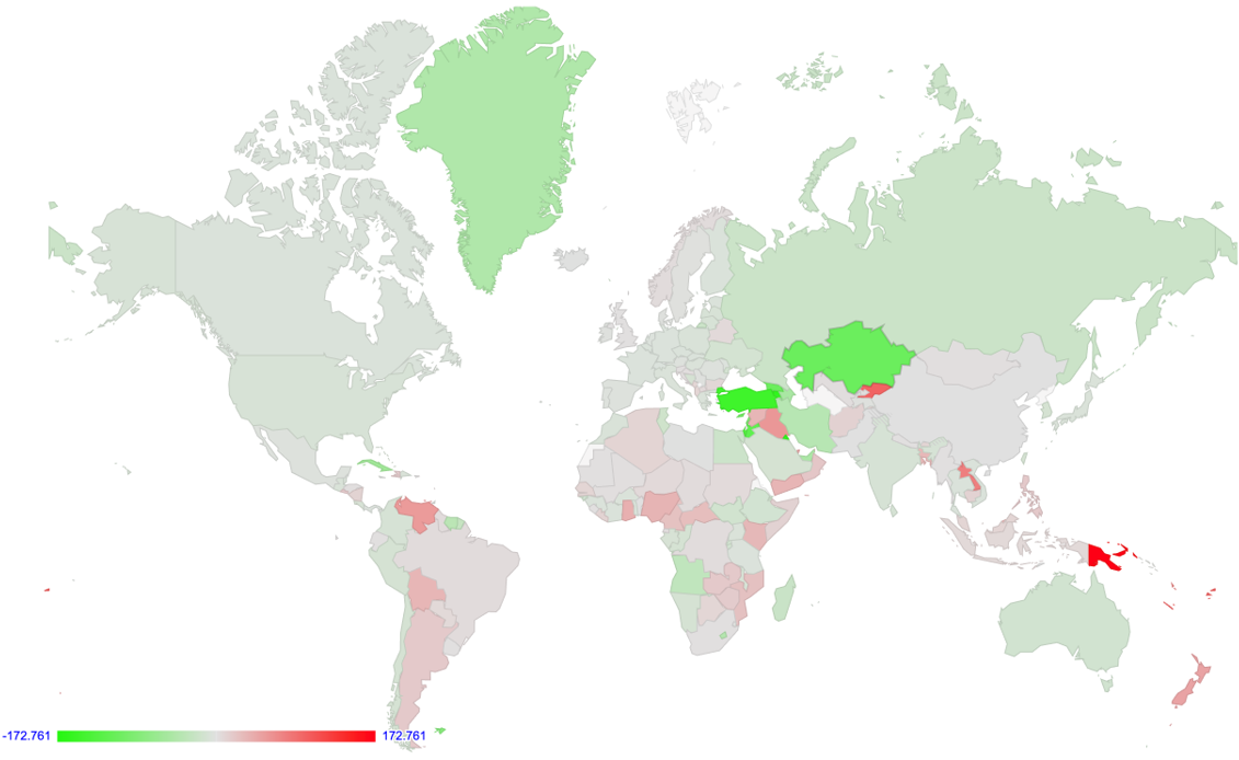 Because the RTT is a critical factor in overall service performance, we have used this RTT difference data to generate a per-economy view of RTT differences, shown in Figure 3.