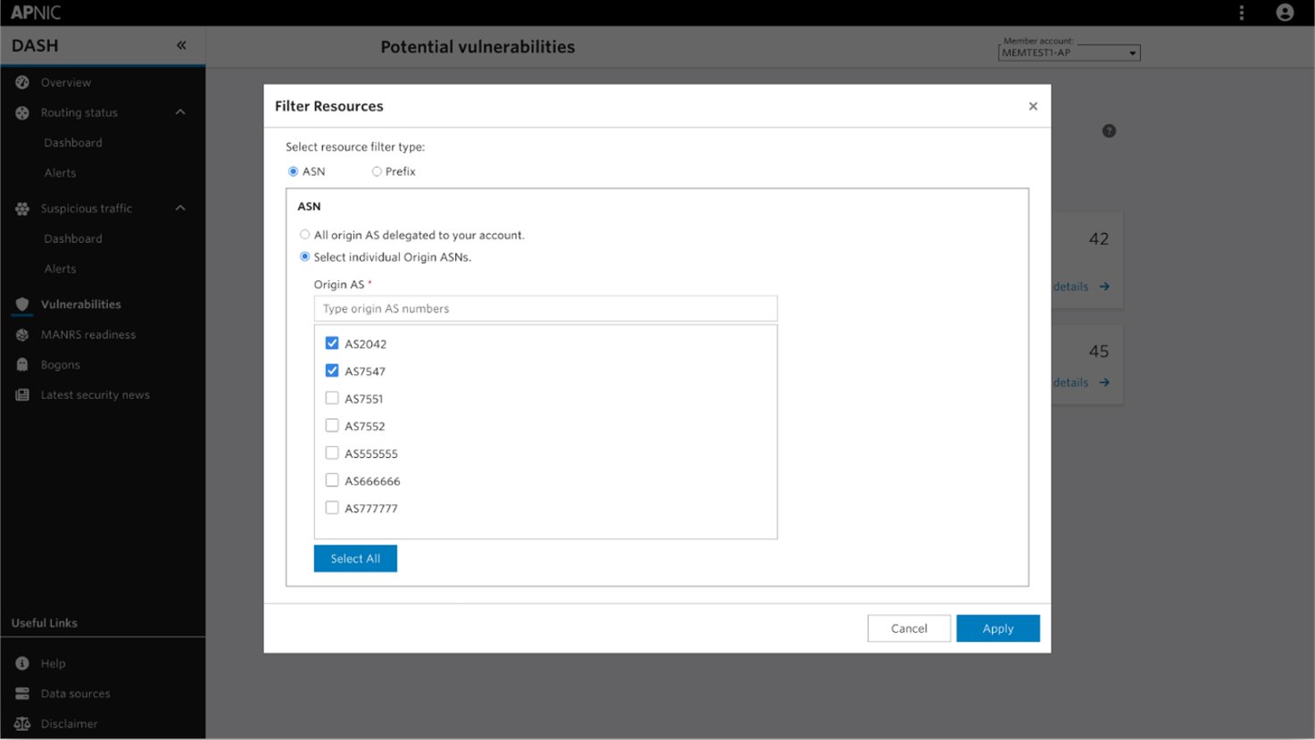 The interface supports filtering by Autonomous System Number (ASN) or prefix, which allows Members to focus on the portions of their network they directly manage. Issues can be dismissed individually or by category, helping operators maintain a clear and relevant dashboard view.