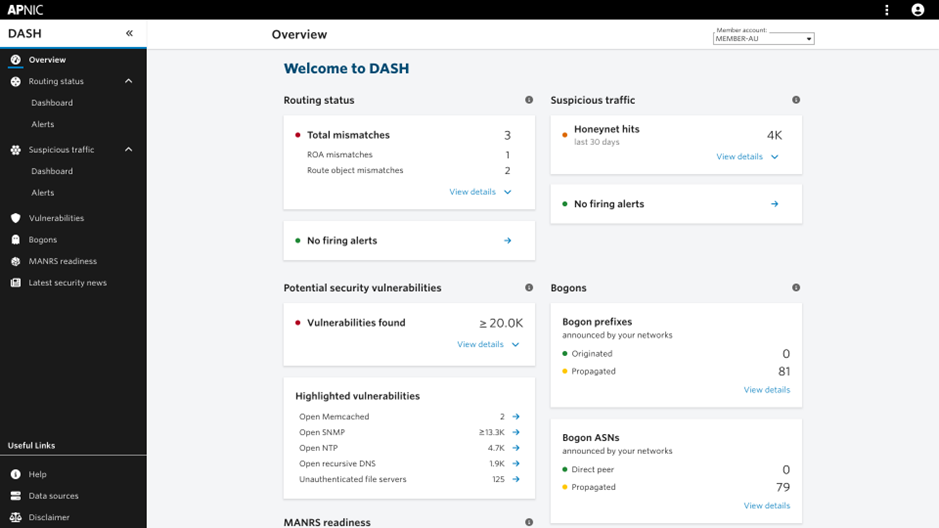 The APNIC Network Health Dashboard (DASH) is a monitoring and alerting platform available to all APNIC Members. It provides a consolidated view of routing and security status for their networks, along with customizable alerts, allowing Members to take timely action to protect infrastructure and maintain Internet stability.
