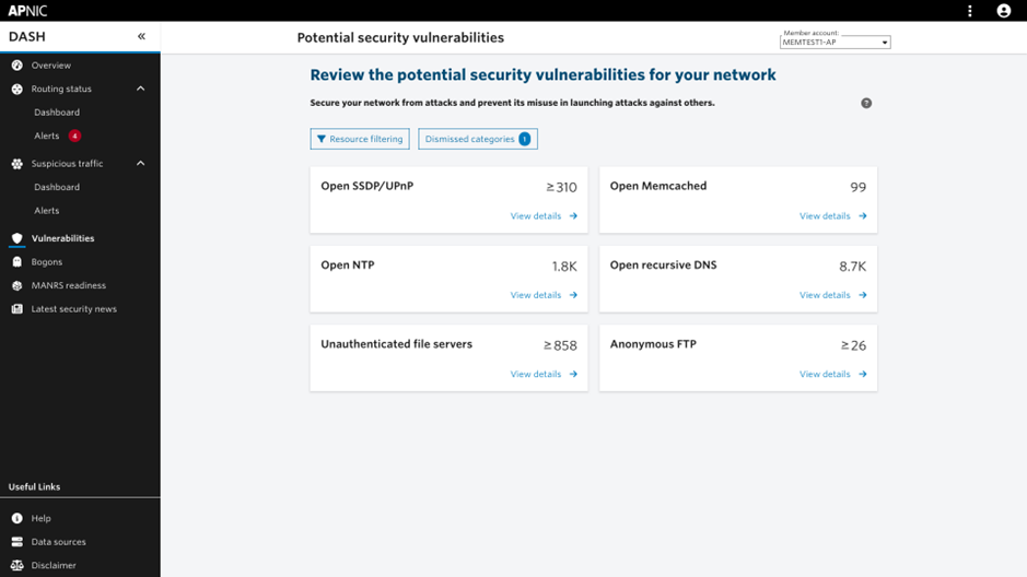 Each category of vulnerability is defined and reviewed by APNIC’s security and network experts. The findings help Members mitigate risks to system integrity and data confidentiality, and reduce the likelihood of their networked computers being used in Distributed Denial of Service (DDoS) attacks, such as amplification or reflection attacks, against others. By presenting these details in an accessible form, DASH assists its Membership to take action and contributes to a safer Internet ecosystem.