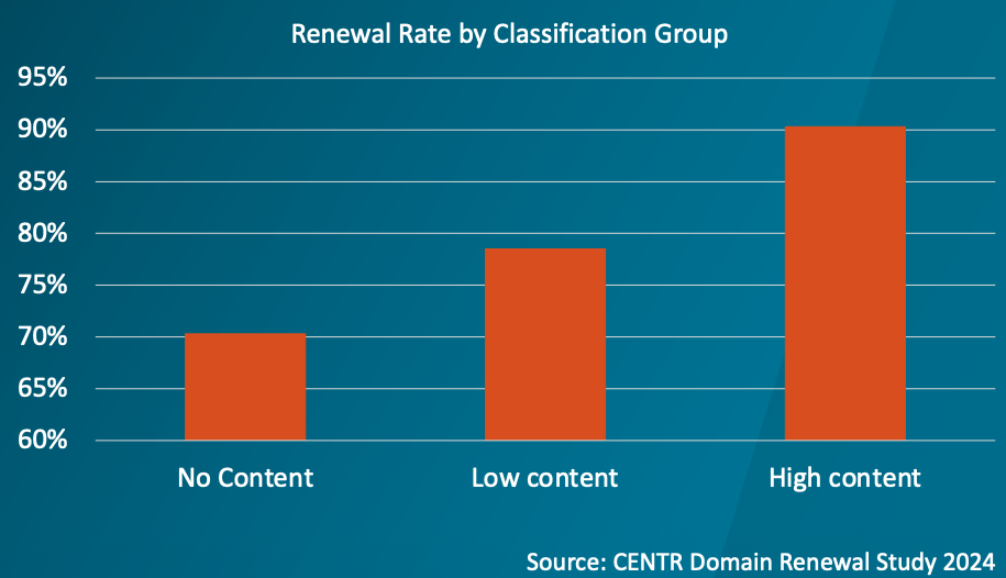 The CENTR Domain Renewal Study reveals something critical: Domain renewal rates directly correlate with usage. Domains with no content renew at 70%. Low-content domains hit 78%. But high-content domains? 90%. The message is clear — getting domains into active use isn’t just good for customers, it’s essential for business sustainability.