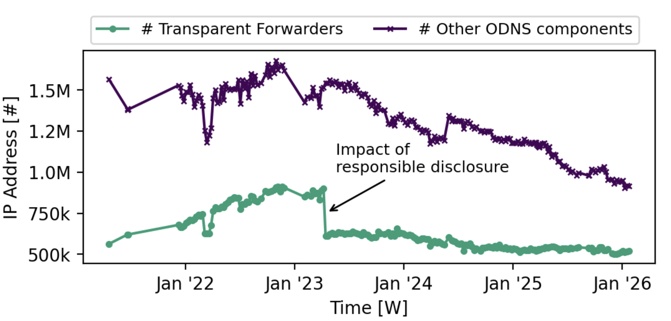 Our analysis shows that the number of recursive DNS resolvers and forwarders (aggregated under ‘Other ODNS components’) constantly decreases while the number of transparent forwarders remains on the same level. Our responsible disclosure removed more than 250k devices from the threat landscape.