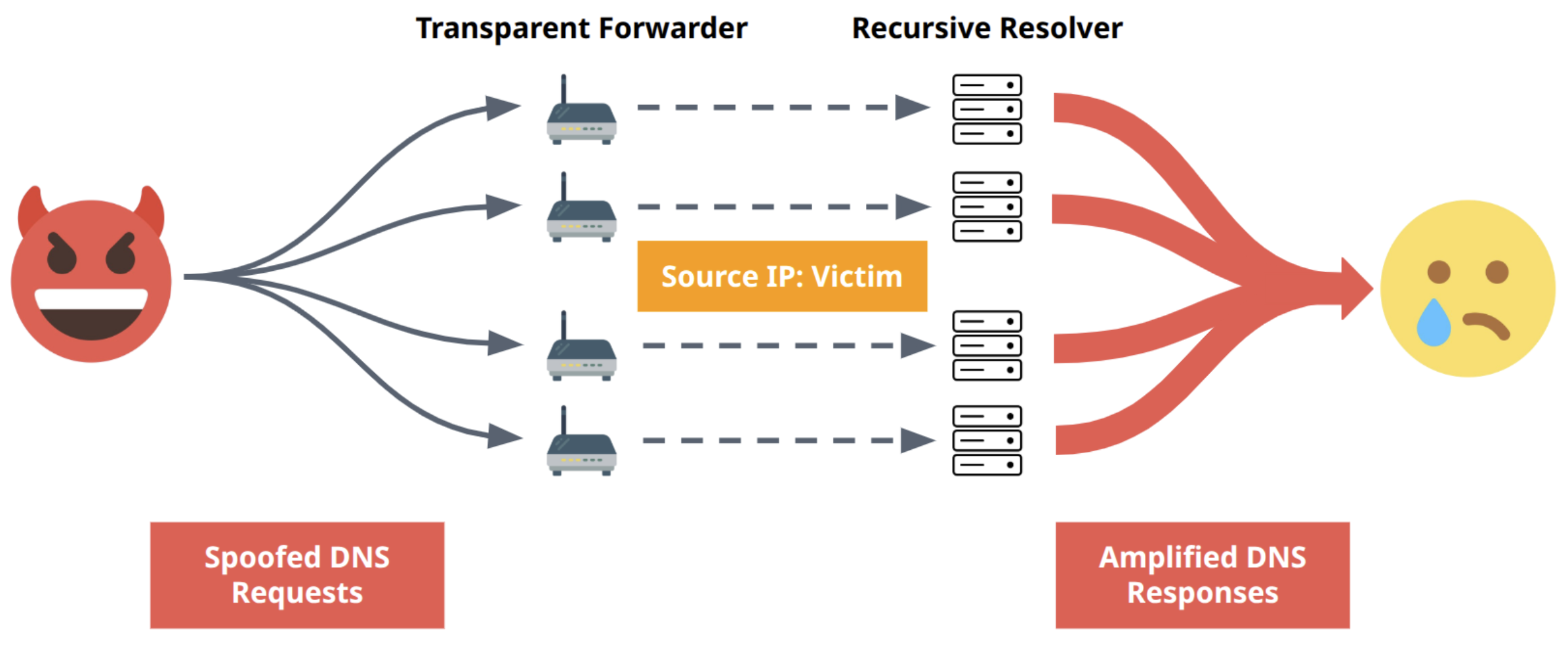 - They do not need to handle the (potentially amplified) response, enhancing the effectiveness of an attack. This is in contrast to recursive forwarders.