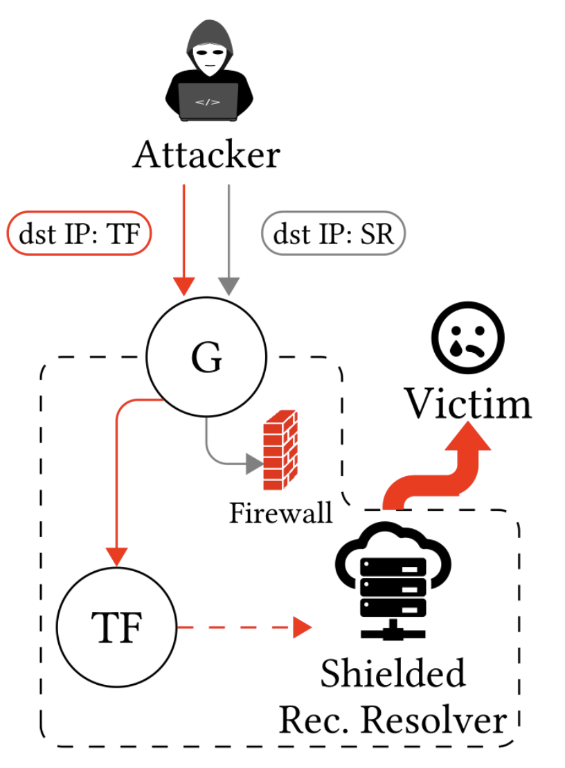 An attacker can take advantage of insufficient firewall rules to access shielded resolvers via using recursive resolvers that are protected by a firewall. While the network borders block traffic directly targeting these resolvers, the firewall of the DNS resolver does not validate the source IP address. Hence, an attacker can trigger responses from this (not so well) protected entity.
