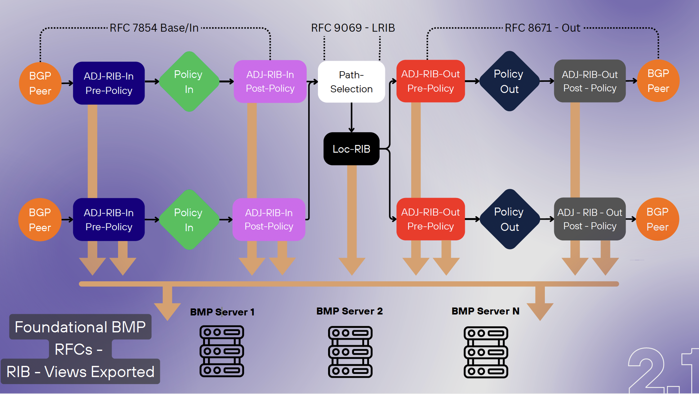BMP exports a BGP speaker’s control state with an associated metadata stream that provides a commentary on the local changes to the control plane of the BGP system, enabling data aggregation and centralized data collection tasks. BMP functions are aligned to the generic internal structure of a BGP engine, as shown in Figure 6.