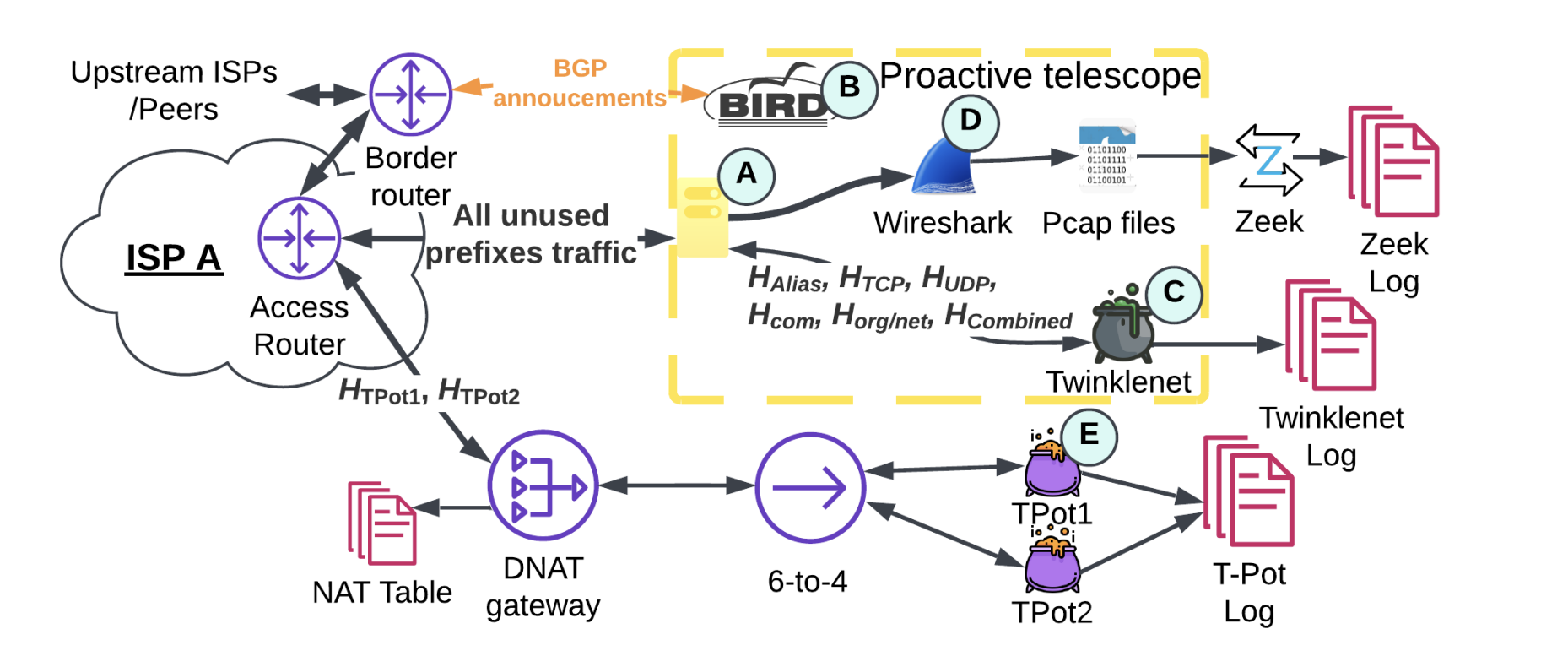 Traditional IPv6 telescopes are passive, quietly listening on unassigned addresses for any incoming packets. This new telescope took a more aggressive, proactive approach — we broadcast the presence of the otherwise dark addresses to the Internet to entice scanners.