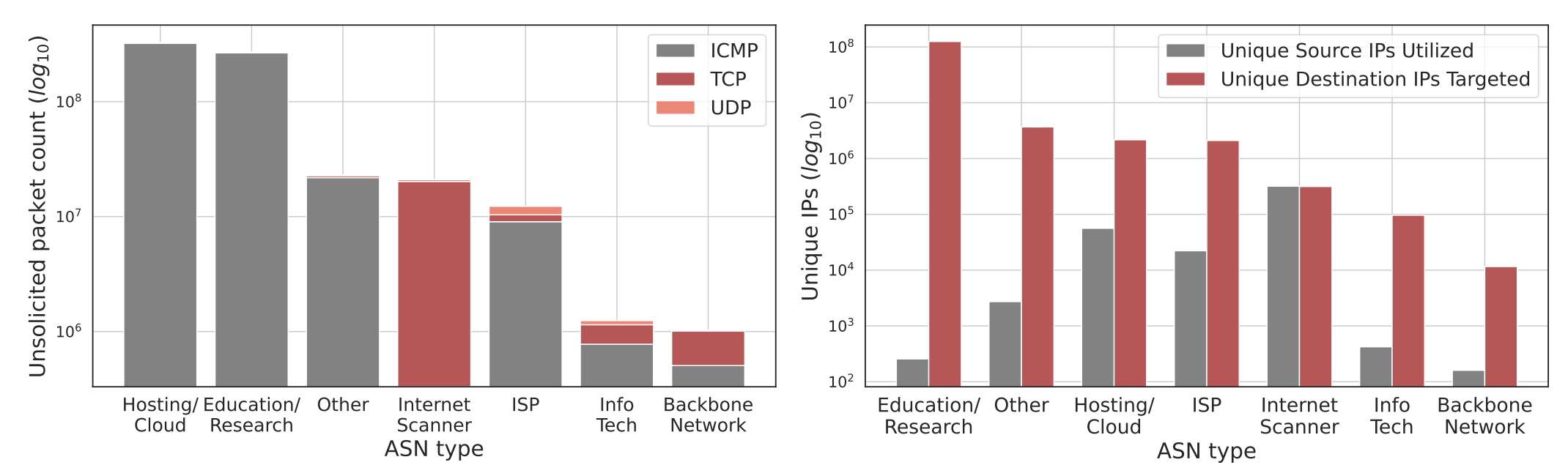 However, there was significant variation across scanner types. The study observed that dedicated ‘Internet scanner’ services (for example, research projects or search engine crawlers) were far more likely to use TCP and UDP-based probes, whereas cloud-hosted or opportunistic scanners stuck mainly to ICMP ping sweeps. This suggests that different actors have different goals and sophistication — some perform full port scans on targets, while others just sweep for any responsive IPs.