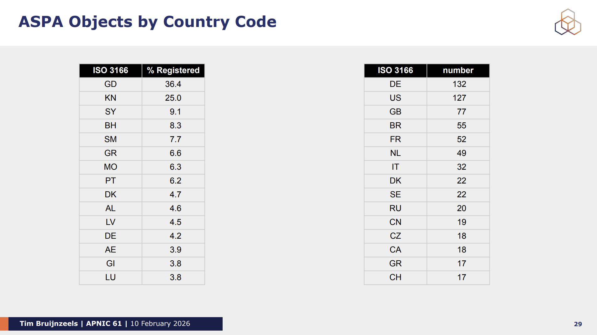 Tim shared statistics on object creation overall, and by economy. He showed how the special AS0 ASPA is being deployed, and some risks regarding the use of AS0 that need to be understood when constructing ASPAs. Tim also discussed the benefits of using route analysis tools like the RIPE NCC Routing Information Service (RIS) to help guide ASPA creation, decisions regarding your BGP peers, and what is signed over.