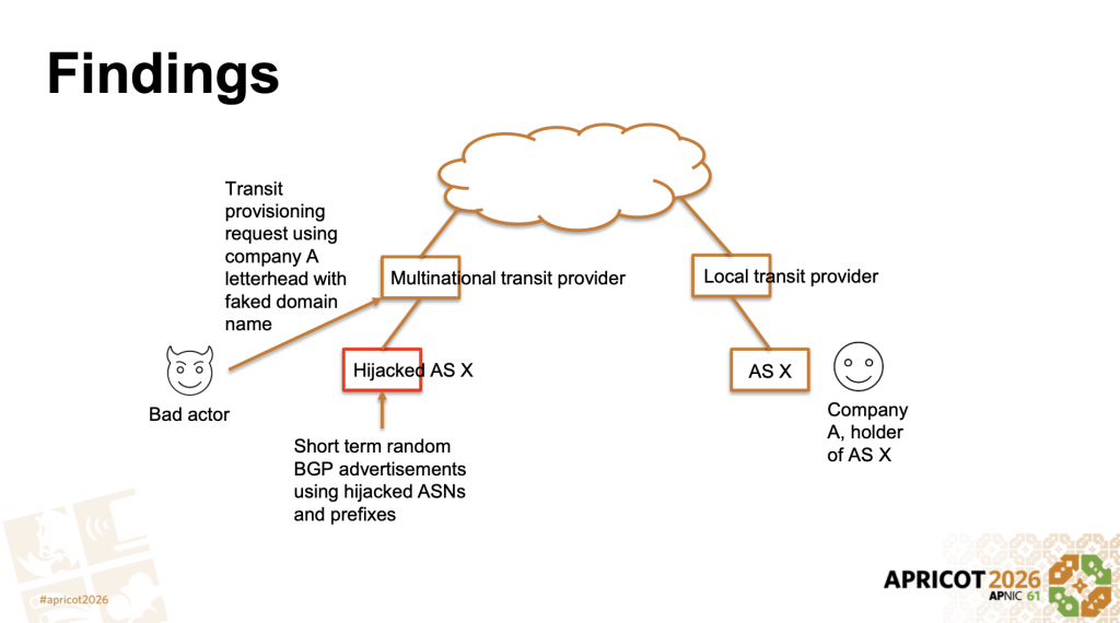 The presentation examined whether the RPKI could mitigate such attacks, through use of both ROA records to assert origination, and ASPA records to flag unexpected ASN adjacencies and inappropriate customer-provider paths.