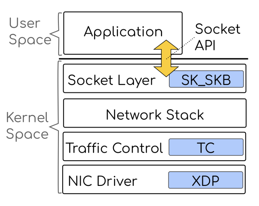 Moreover, when offloading an application, there are multiple hooks to select (Figure 2). For example, the program can attach to the NIC driver (the XDP hook) and operate on individual packets, which avoids context-switching, data-copying, and network stack processing. Some applications rely on the services of the transport protocol, like in-order packet delivery. These applications can attach to the socket layer (the SK_SKB hook) that is after the network stack processing and still benefit from offloading.