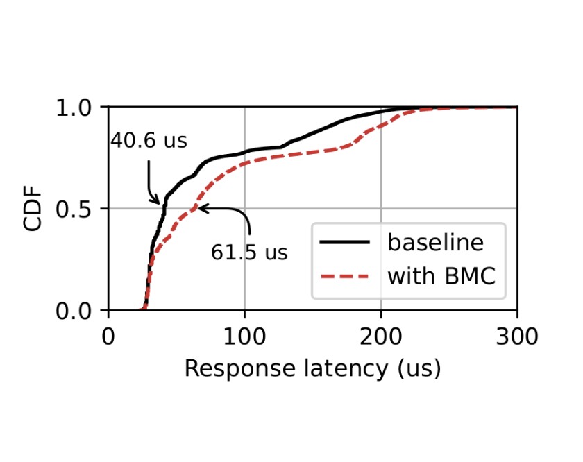 The question that BMC and others have not addressed is, how does this offloading affect the performance of program logic running in userspace? To answer that question, we ran BMC and used a workload that generated 60K requests per second. 55K of those requests hit the in-kernel cache, while the other 5K needed to be processed in userspace. We compared the performance of this setup to a baseline where BMC was not used.