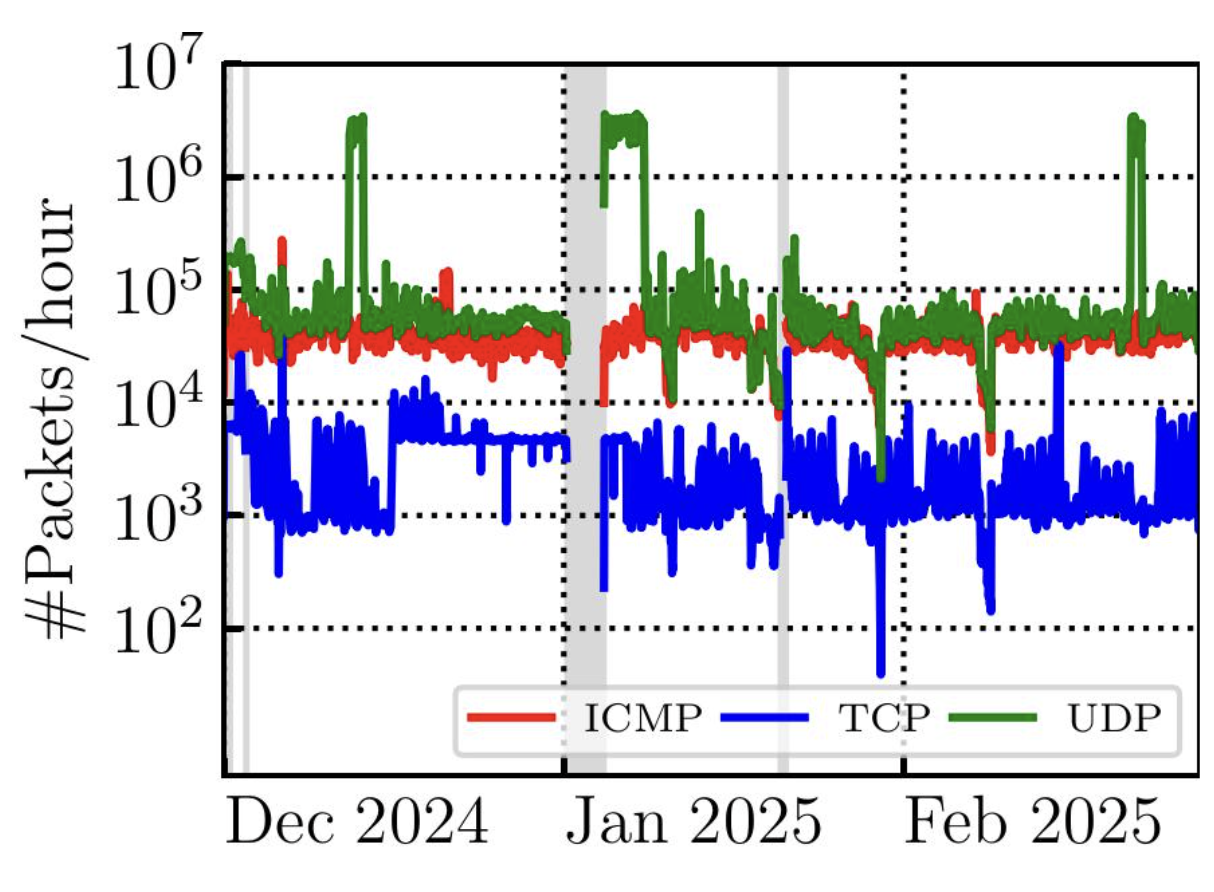 - Faulty configurations were also widespread. Dozens of clients repeatedly sent DNS queries to bogon or localhost IP addresses — behaviour often caused by misconfigured VPN software, or incorrect DNS resolver settings. Similarly, we identified misconfigured Network Time Protocol (NTP) clients continuously querying unreachable peers, generating a steady stream of erroneous packets.