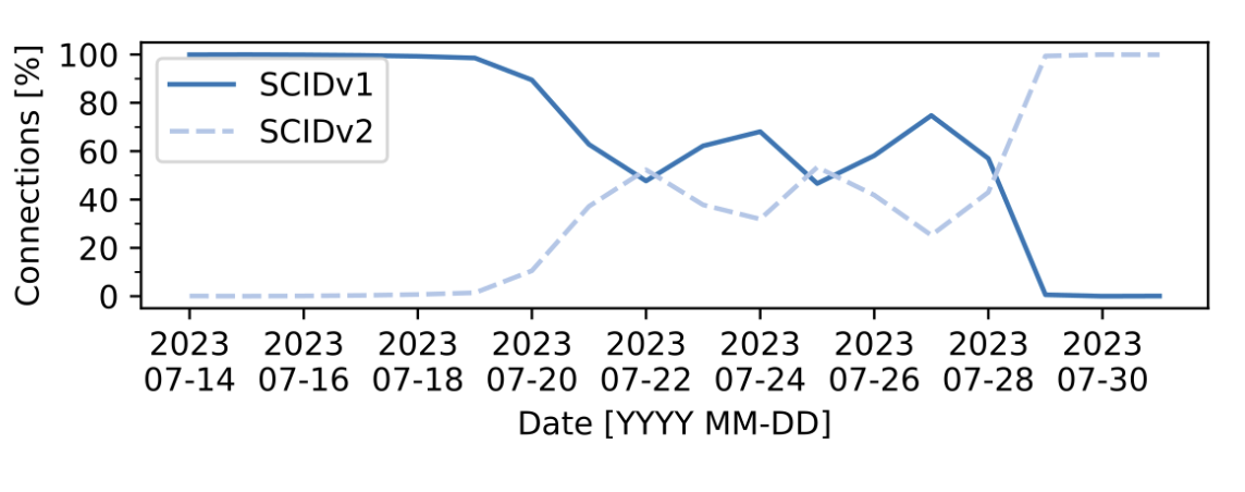 Tracking the reception of QUIC backscatter from Meta allowed us to observe the migration to a new load balancer configuration in July 2023 (Figure 3). The migration took 10 days, and follow-up active measurements confirmed the changes.