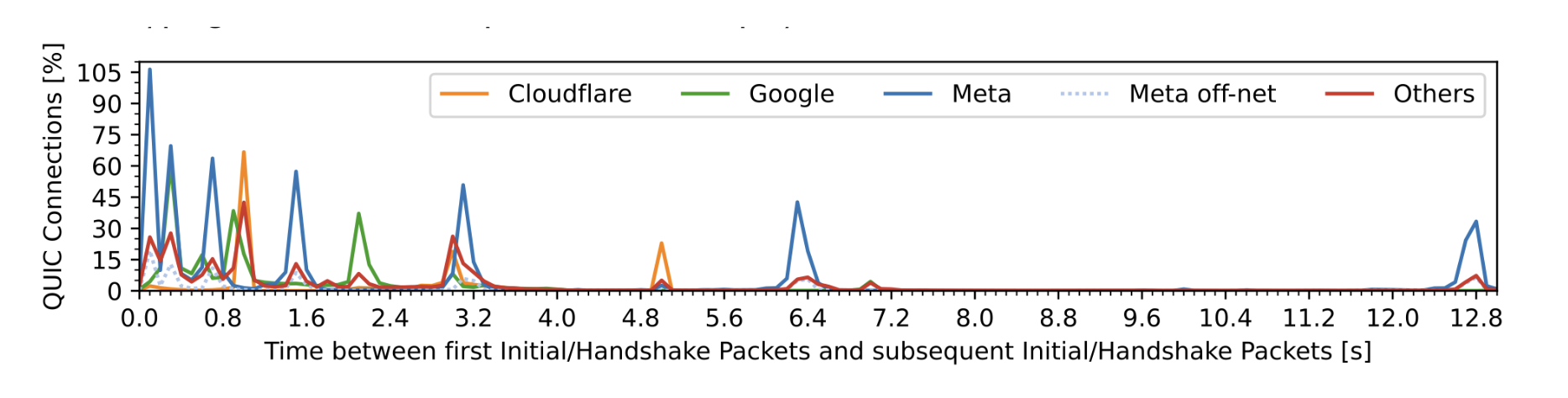 Overall, we detected the shortest re-send timeouts and most re-transmissions from Meta. This indicates that Meta reacts faster to packet loss and expects shorter delays between clients and servers than Google and Cloudflare. In comparison, Google and Cloudflare reserve fewer resources to cope with faulty connections. This reduces vulnerability to QUIC flood attacks that build up state.