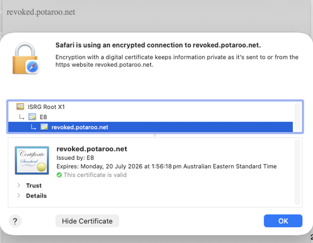 In the preparation for this article, I asked Let’s Encrypt to issue a certificate for the DNS name revoked.potaroo.net. This is that certificate: