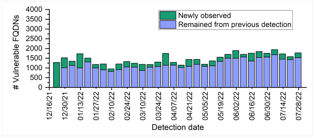 Unravelling-fig6 ← Previous Next → Figure 6 — Detection results of hosting-based dangling domains (weekly cumulative).